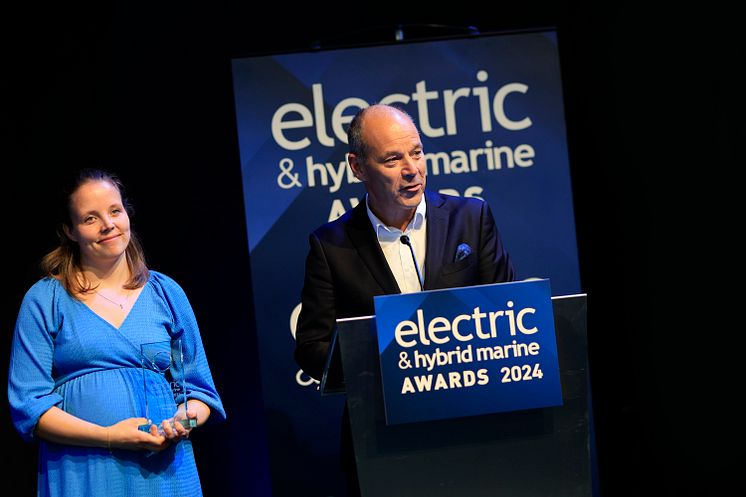 Prosjektleder Ada Rødland og driftsdirektør Gerry Larsson-Fedde i Hurtigruten mottok prisen for beste konseptskip-design under Electric & Hybrid Marine Awards. Foto: Electric & Hybrid Marine Awards