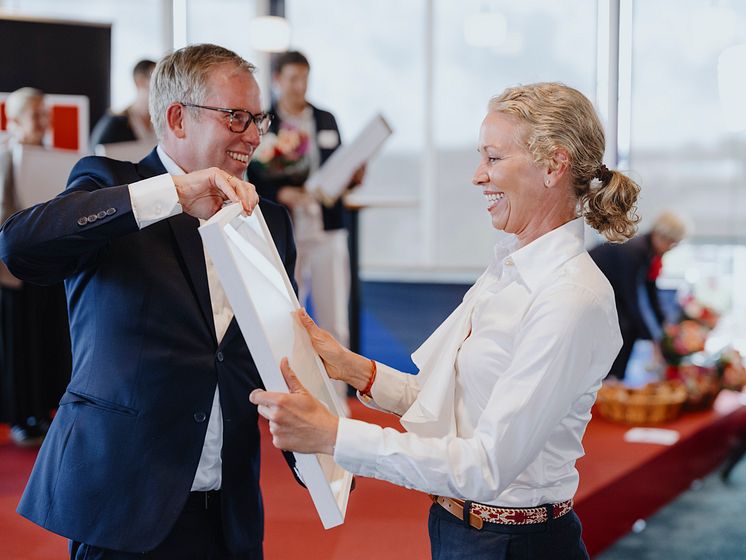 Hedda Felin i Hurtigruten, mottar diplom fra Håkon Haugli i Innovasjon Norge. Foto:Innovasjon Norge