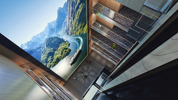 Spanning seven decks and 17,5 meters, the tallest screen at will give the Hurtigruten guests a truly unique welcome when they step on board MS Roald Amundsen – the world’s first hybrid powered cruise ship.