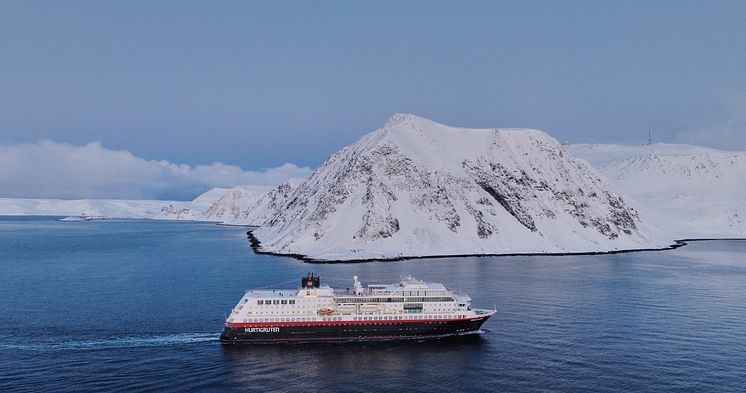 MS Trollfjord utenfor Honningsvåg i Finnmark. Foto: Kristian Dale / Hurtigruten