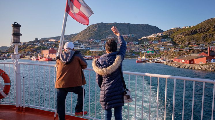 • Passengers wave flag Sarfaq Ittuk. Photo - Lisa Germany Visit Greenland