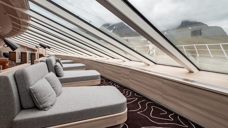 EXPLORER LOUNGE: Her kan du nyte utsikten mens du slapper av på en av dagsengene. Foto: ESPEN MILLS/Hurtigruten