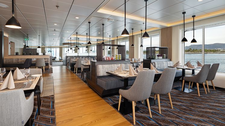 DINING WITH A VIEW: From 2021, you can explore the Norwegian coast in comfort. This is the Lindstrøm Restaurant on newly upgraded MS FInnmarken - that will be renamed MS Otto Sverdrup from 2021. Photo: ESPEN MILLS/Hurtigruten